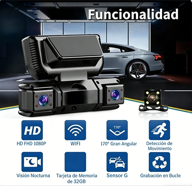 COBERTURA INTEGRAL MULTICANAL - Simultáneamente graba la carretera delantera, el interior de la cabina y la vista trasera, proporcionando una vigilancia completa que captura todos los ángulos para máxima seguridad y tranquilidad en cada viaje que realizas.